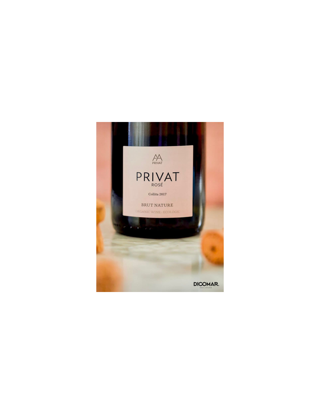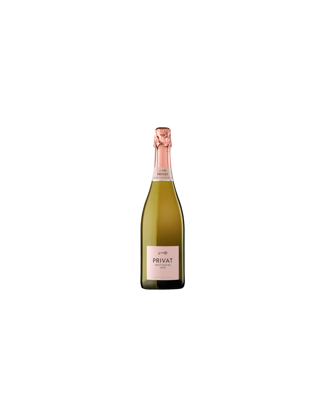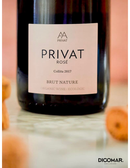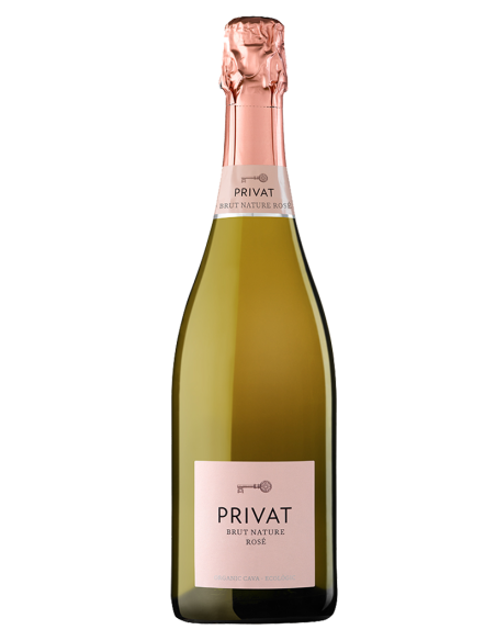 Privat Rosé Brut Nature ecológico (CCPAE), con mínimo 15 meses de crianza en botella. Nace de Pinot Noir (75%) y Chardonnay (25%): fruta roja fresca, notas cítricas y un toque de panadería fina. Seco de verdad (brut nature), burbuja integrada y final limpio que pide otra copa.